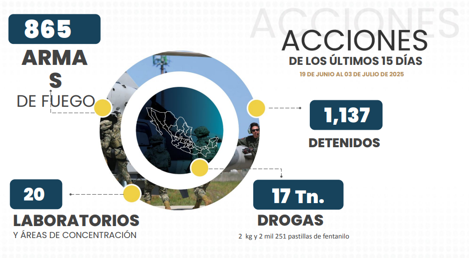 Además, se confiscaron 13,275 armas de fuego, 2,289,112 cartuchos y 2,041 granadas. También en los últimos 15 días han asegurado una aeronave con 400 kilos  de cocaína el 3 de julio en Tecomán, Colima, mil kilos de metanfetaminas aseguradas el 3 de julio en Puerto Pichilingue, La Paz, Baja California Sur.