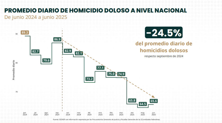 Por lo que respecta al homicidio doloso de junio 2024 a junio 2025, ha disminuido 24.5% en comparación de septiembre 2024 con junio 2025 indica 21 homicidios diarios menos.
