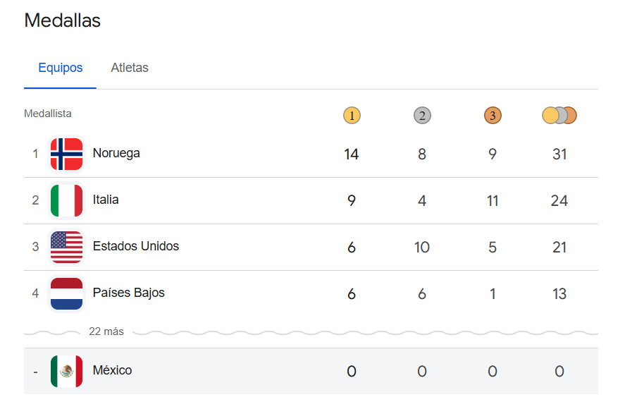 Los Juegos Olímpicos que se llevan a cabo en Milano Cortina 2026, del 6 al 22 de febrero marchan de la siguiente manera: